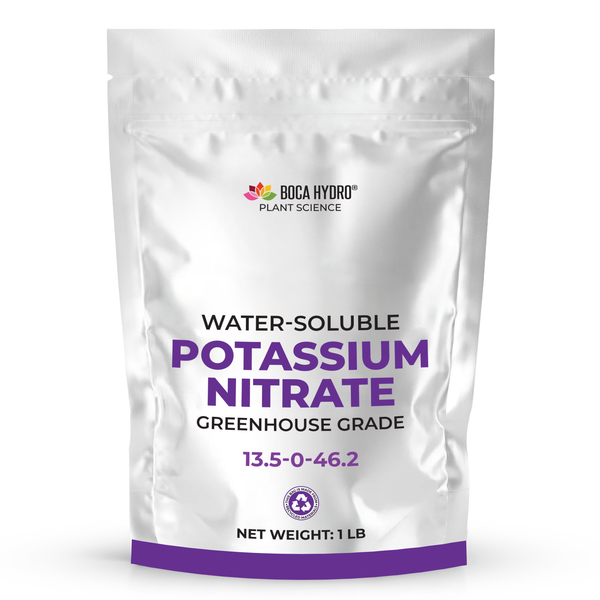 Boca Hydro Potassium Nitrate is a premium-grade, fully water-soluble fertilizer delivering 13% Nitrate Nitrogen (NO₃⁻) and 46% Soluble Potassium (K₂O). It is ideal for crops requiring fast-acting, immediately available nitrogen and potassium, making it perfect for fruiting vegetables, ornamentals, leafy greens, and flowering plants during mid-to-late growth stages. Nitrate nitrogen promotes lush green growth without ammonium buildup, while potassium boosts flowering, fruit quality, and plant resilience.